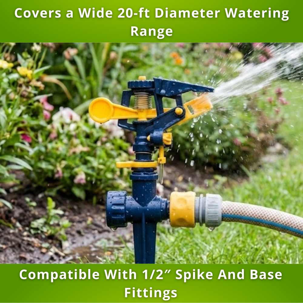The Vinka Impulse Sprinkler covers a circular area with a diameter of up to 20 feet, providing uniform watering for lawns, gardens, patios, and driveways.